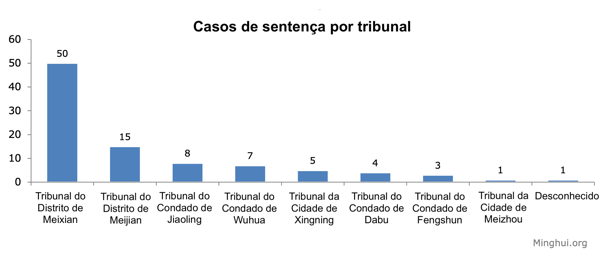 As penas de prisão (totalizando 94 ocorrências, visto que 16 praticantes foram condenados duas vezes) foram proferidas por oito tribunais locais: o Tribunal do Distrito de Meixian, o Tribunal do Distrito de Meijiang, o Tribunal do Condado de Jiaoling, o Tribunal do Condado de Wuhua, o Tribunal da Cidade de Xingning, o Tribunal do Condado de Dabu, o Tribunal do Condado de Fengshun e o Tribunal da Cidade de Meizhou.