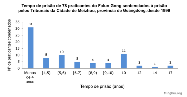 As 94 penas de prisão variaram de um ano e cinco meses a 12 anos, com uma média de quatro anos e oito meses. A maioria das penas mais pesadas (até 10,5 anos) foi aplicada aos praticantes que participaram da conscientização sobre a perseguição, incluindo a impressão de materiais informativos ou o envio de informações por telefones celulares.