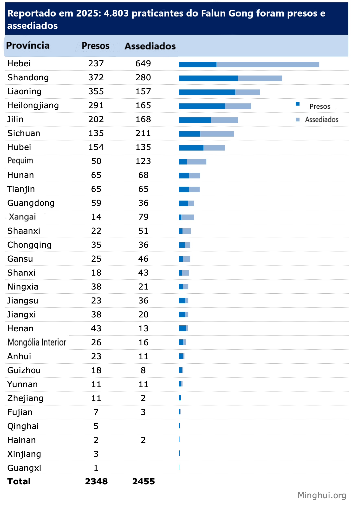 Os exemplos acima são apenas três dos 4.803 casos de prisão ou assédio a praticantes do Falun Gong que foram relatados em 2025. Devido à rígida censura de informações do Partido Comunista Chinês (PCC), que muitas vezes impede os correspondentes do Minghui de coletar e relatar a perseguição em tempo hábil, alguns dos incidentes relatados ocorreram antes de 2025.